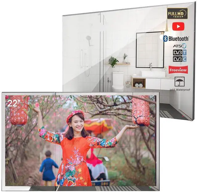 Elegant Bathroom & Hotel TV Upgrade your space with this 22 inch mirror TV, designed with the latest technology. When powered off, it seamlessly transforms into a full mirror. Featuring U. S. ATSC tuner compatibility, IP66 waterproofing, and a luxurious mirror finish, its perfect for bathrooms, hotels, kitchens, or any room where style meets functionality. Built-in powerful vibration speakers and an IP68 waterproof remote control ensure an exceptional viewing experience, even in damp environments. ^^ Smart Full HD LED TV Experience the future of TV with this smart, Android 11.0 -powered digital TV.