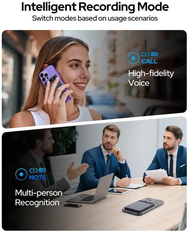 ^^ [- ]: The VISOUD voice activated recorder employs dual recording engines. An air-conduction sensor captures high-quality ambient sound from meetings and presentations, while a vibration-conduction sensor () ensures clear call recordings by capturing internal phone audio. The audio recorder utilizes AI noise reduction technology for enhanced audio clarity.