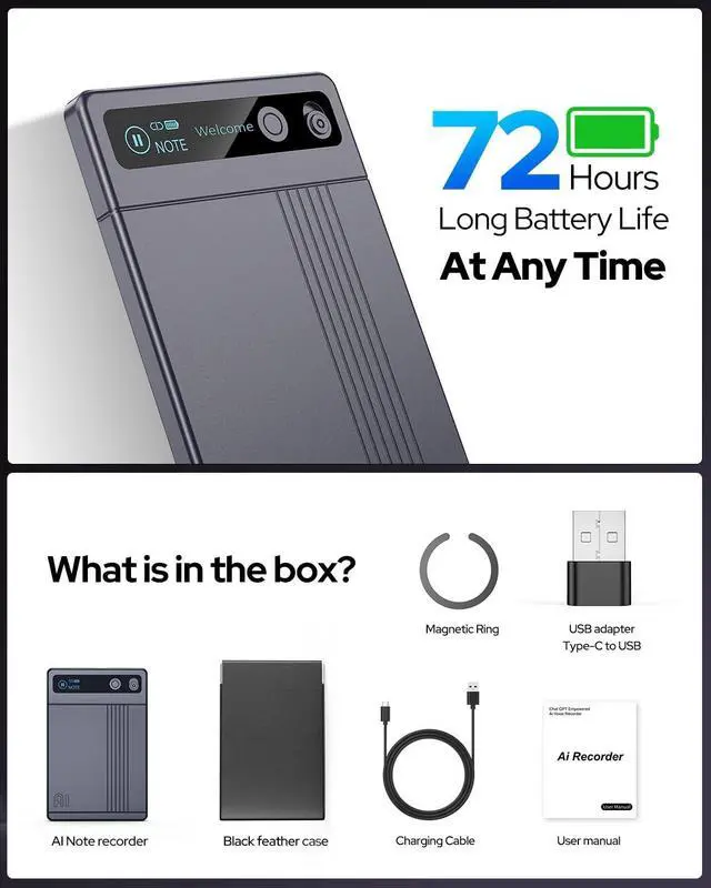 ^^ [- ]: The VISOUD ai voice recorder with transcription features a high-capacity 640mAh battery, delivering up to 72 hours of continuous operation on a single charge. Enjoy worry-free recording and uninterrupted productivity, backed by exceptional endurance for reliable performance.