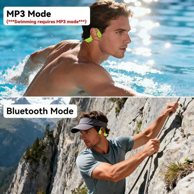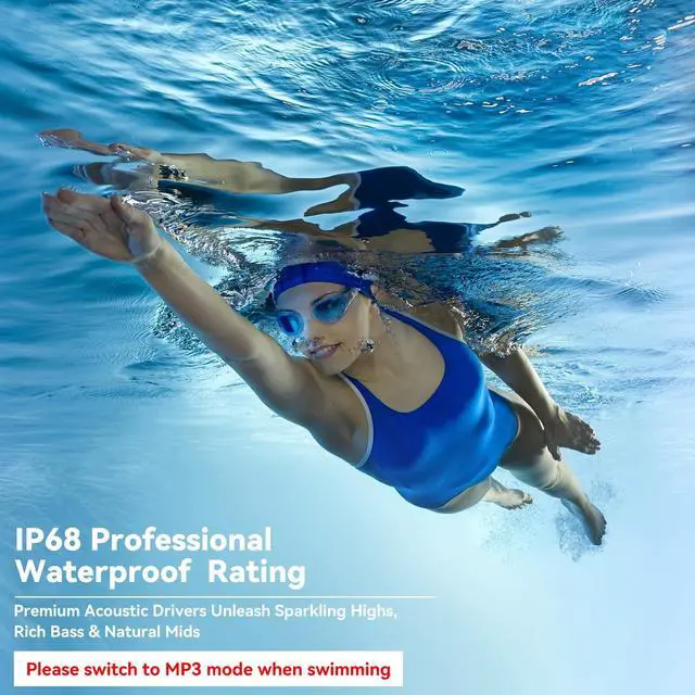 SWIMMING: MP3 MODE ONLYIP68 Waterproof Swimming Headphones boast an IPX8 waterproof ratingresisting water immersion to let you tackle water sports like swimming, snorkeling, surfing and other outdoor activities with confidence. They feature an ergonomic ear-hook design that evenly distributes pressure, ensuring comfort during extended wear and a secure fit that wont slip or shift during various sports.