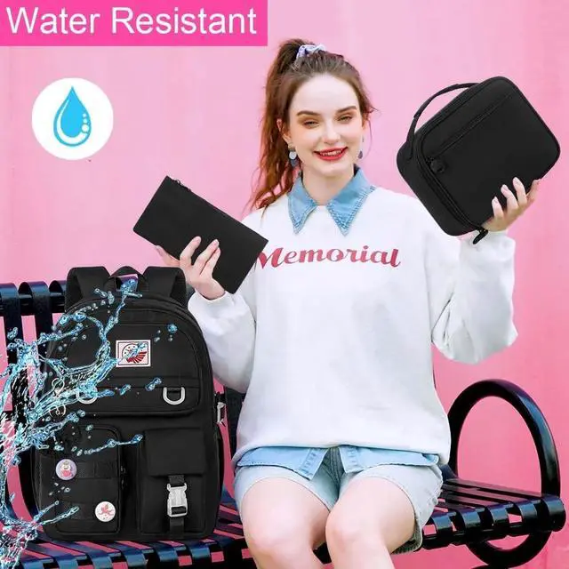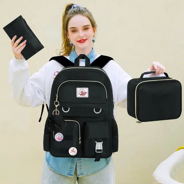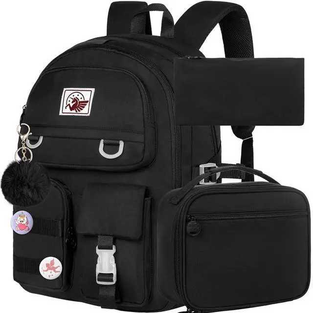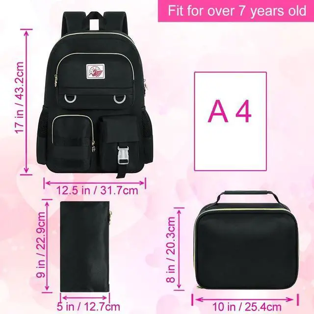 Girls Backpack SizeThe backpack for women size is 13.8"x7.5"x17.1" (L*W*H), water resistant lunch box size: 10" high 9 "long 3.5 "wide, pencil box size: 9" long 5 "high 0.3 "wide. The laptop backpack with padded compartments is suitable for tablets of 16 inches. This school backpack comes with a plush ball key pendant and two cartoon badges as gifts, making the bag more fashionable and cute.