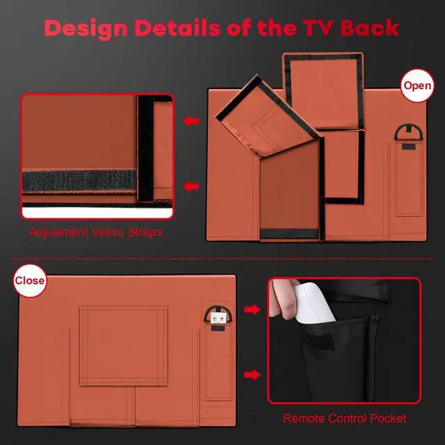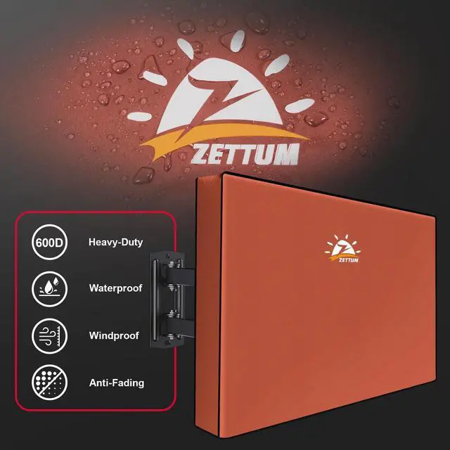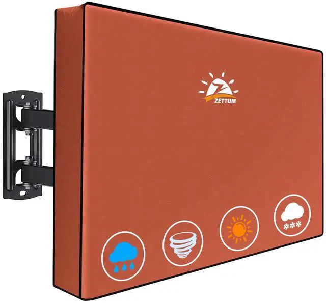 Zettum will be the tough protector of your outdoor TV! ^^ ^^ Fit All TV Mounts with Remote Control Pocket ^^ - Upgrade adjustable velcro design making the cover secure to the TV super tightly, no wind can blow away Zettum TV covers! Fit most universal TV wall mount brackets like double wall mount, single wall mount, and tilting TV mount. The additional remote control pocket design will protect your TV remote control all day. ^^ ^^ Fading-Resistant Cover for Years ^^ - UV Test can reproduce the damage caused by sunlight, rain, and dew through the equipment.