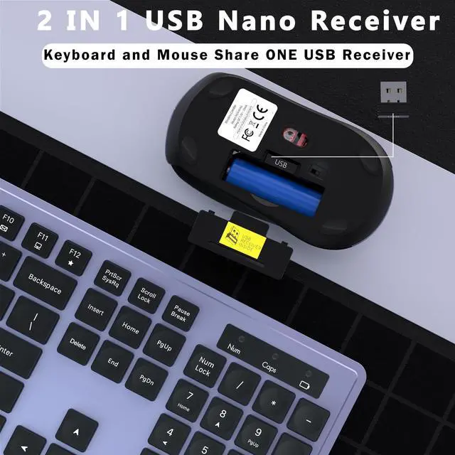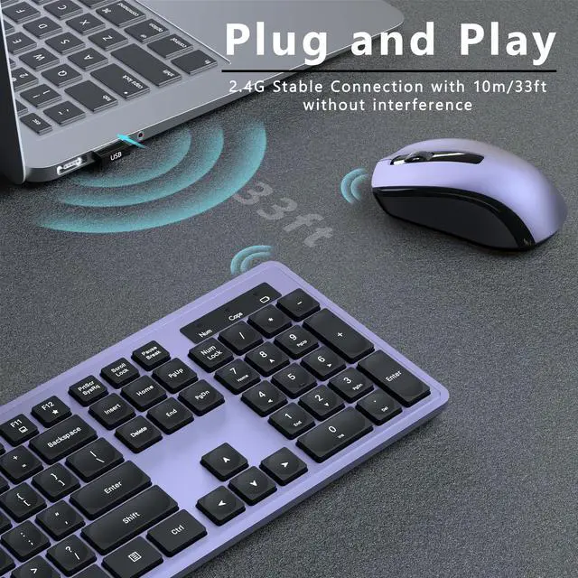 PLUG AND PLAY: Wireless keyboard and mouse share one USB receiver (under the mouse cover), plug the USB receiver into the computer USB port and it will work. 2.4GH z wireless technology provides a reliable connection range of up to 33ft (10 meters) without any driver ^^