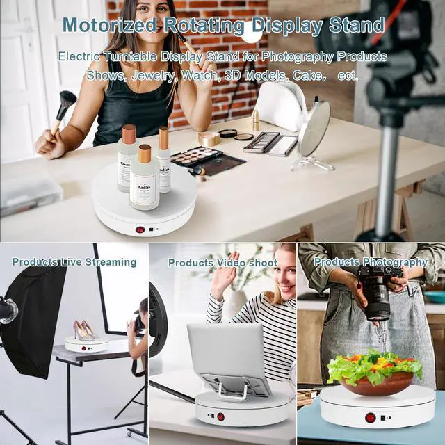 power supply: DC 15V. Convenient to carry and keep. ^^ Smooth, No Shaking- The rotating stand has a smooth motor (50db) to avoid shake and noise during the video. Great tool for 360 degree images, short video, 3D models, exhibition and other product display ^^ Wide Application Display Stand- Used for Product Display, Photograph Show, Theme Exhibition, Window Display, Cube Spin Display, Advertising. Provide Customer 360 degree view of your product and allow photographer to take photos in 360 degree view. Improve the exhibition effect in showroom, superstore, trade show, etc.