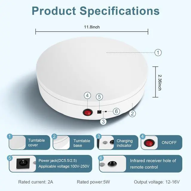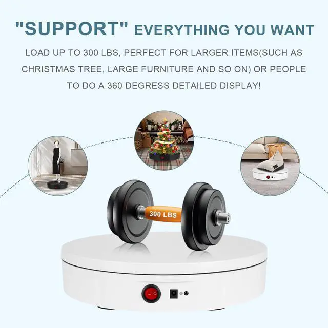 Rechargeable Wireless Rotating Display Stand- Two power supply modes: USB cable and built-in Rechargeable battery operated rotating. you could take it outdoors or anywhere to complete your photography No more worrying about finding a socket or being tethered to a specific location. ^^ Remote Control Speed & Angle- The speed range is 22-60 sec/rev (the fastest speed is 22 seconds per circle & the lowest speed is 60 seconds per circle) total 10 gears speed adjustable. Infrared remote control with controller available continuous and intermittent rotation modes, 45/90/180 angle circulation turning modes. ^^ 360-Degree Smooth Rotation and Lower Noise- The stand rotates a full 360 degrees, allowing customers to view your products from all angles. Widely using in retail stores, trade shows, Crystal Art, Jewelry or even in the home to showcase collectibles or artwork. 300 lbs centric loading capacity, 11.8 inch diameter, net weight 3 lbs, adapter