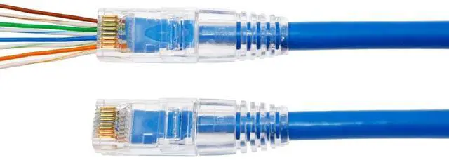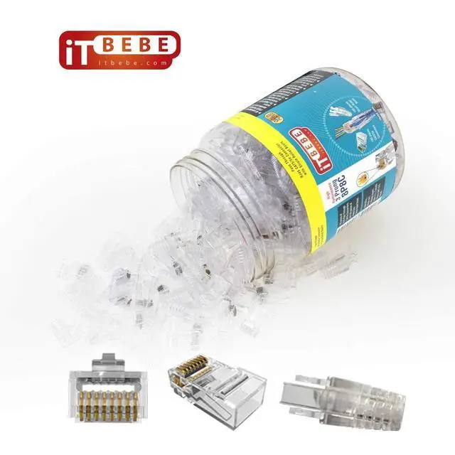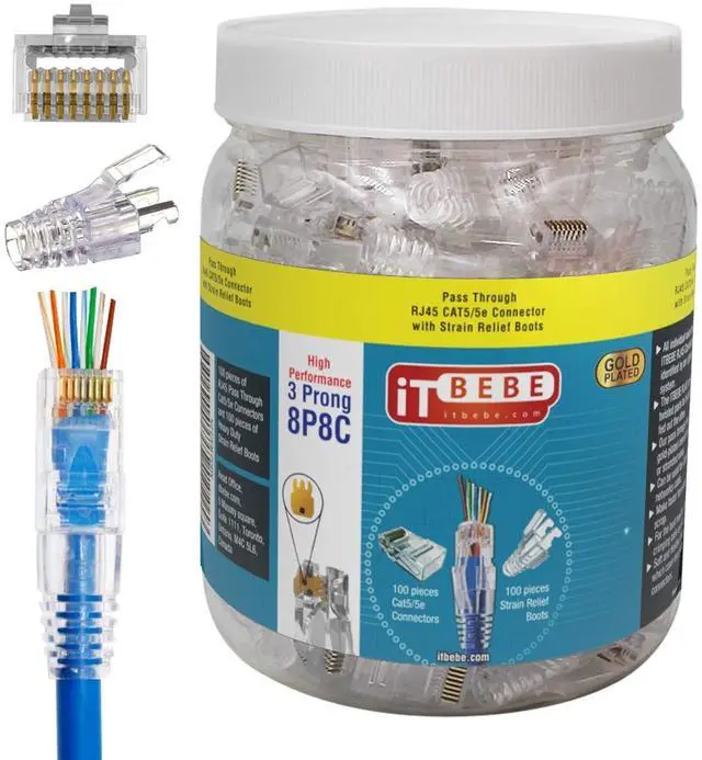 200-PIECE combo jar includes 100 clear gold-plated Pass Through RJ45 Cat5/5e connectors and 100 clear Pass Through RJ45 Cat5 Strain Relief. Make snag-proof ethernet connections for your Cat5e data network installations. Designed to work with both STRANDED and SOLID CAT5/5e Cable. ^^ ELIMINATE CROSS-TALK and other network interference when you make solid ethernet cable connections. ITBEBE RJ45 Pass Through Connectors and Strain Relief enhance flex life performance and tensile strength. ^^ PASS-THROUGH DESIGN allows quick, accurate wiring order and reduces distance between wire twists and contacts. ITBEBE Pass Through RJ45 connectors boast a 3-prong design enhances alignment with the conductor.