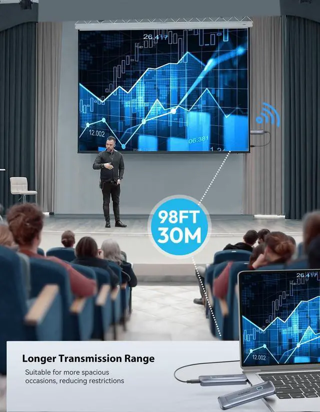 ^^ Highly Versatile: The Wireless HDMI is compatible with a wide range of devices, seamlessly connect PC, laptop, camera, TV box, projector, monitor, and HDTV. Ideal for business presentations, conferences, teaching, movie, outdoor events, and family gatherings. Comes with Micro HDMI/Mini HDMI adapter and Type-C to HDMI adapter, offering a wider compatibility for a variety of devices. ^^ Unmatched Clarity and