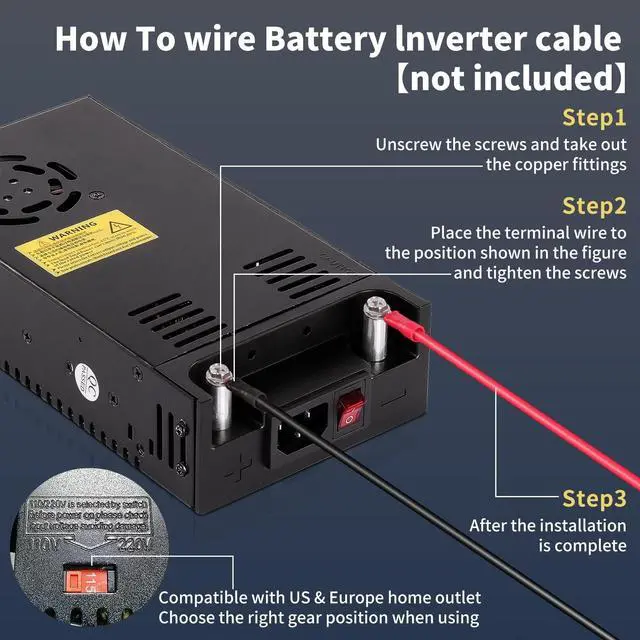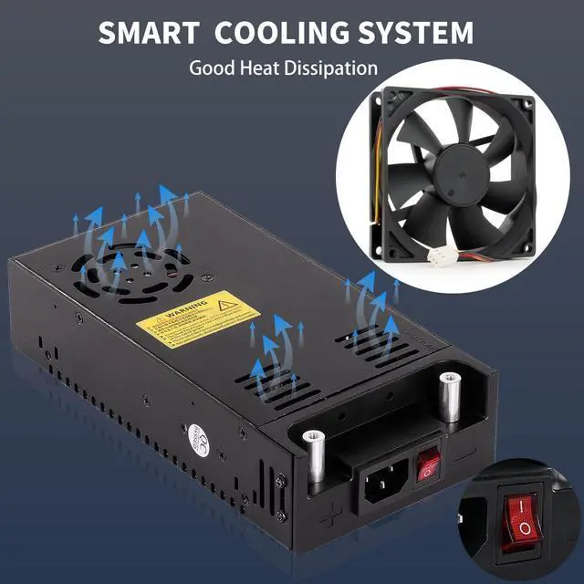 ADJUSTABLE VOLTAGE AND CURRENTInput voltage: AC 110V / 220V (85-145V / 185-265V); Output Range (12V 1A-5A, 12W-60W ) or (12V 10A-50A 120W-600W), voltage input will adjust automatically to SMPS Model, Output current Mainly depends on your device, e. g. DC 10A 120W, 20A 240W, 40A 480W. Max current up to 50A, Power 600W. ^^ NEW VERSION AC TO DC CONVERTERThis 12v power supply build with Black matte Aluminum alloy shell, that is sturdy and will not scratch. Built-in wire integrated design, Dual power connection methods. all copper nickel-plated terminal material, Super convenient for devices with clamps. You can clamp to the two cylindrical contacts directly. which has good electrical conductivity and high conversion efficiency, corrosion resistance, aging resistant. ^^ SMART COOLING SYSTEM600W Power Converters Aluminum Shell are designed with many heat dissipation holes, Built-in Cooling fan and dust-proof net, which effectively prevent dust from entering, ensure the stable rotation of the electric fan and prevent the circuit board from burning; moreover, anti-skid pads are added to the bottom in this 110v to 12v converter, which can also make the bottom better heat dissipation and work more stable.