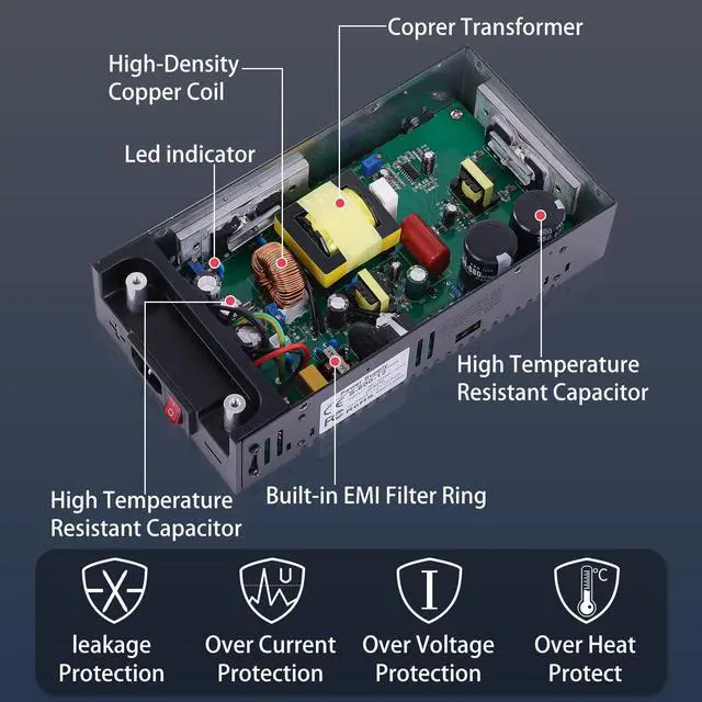 One Key Operate: With red button on/off switch function, more safe and convenient power start/stop operation. Net weight only 2.6 Pounds( 1.18 kg), Light and Portable. ^^ APPLICATIONS WIDELYPerfect Choice to Power LED Strips, 3D Printer Power Supply, Camper Power Converter, CCTV Power Supply, Medical Power Supply. It also used in industrial automation Equipment, Car Stereos, Radio, Motor, Computer Project, Boat, Humidifier, Brushless Motor, Household Appliances, Electronic Devices. Automation Equipment, Computer Project-Servos, Planting, Research Rooms, Air Compressors, Displays and more 12V Device.