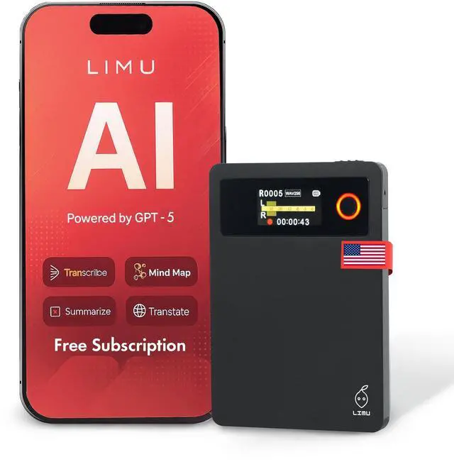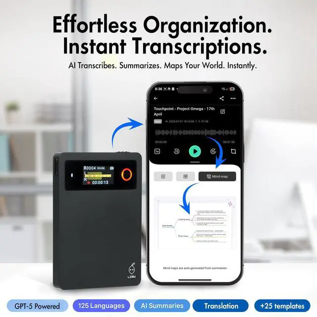 Transcription & Summaries: This AI voice recorder uses GPT 5 and turns talks into clean transcripts, summaries, actionable mind maps and translations across 125 languages. Ideal for an AI note taker, transcription device and translation devic ^^ Premium