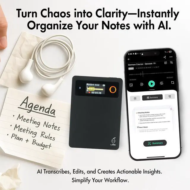 Control (iOS/Android): Start, stop, transcribe, and organize with the voice recorder app in seconds. This AI recorder notetaker & digital note taker is perfect for students or professionals needing effortless, smart voice recording.