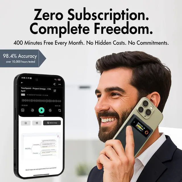 Metal Build: Aluminum alloy + ABS body (60 g) feels solid and professional. Captures at WAV/OPUS 256 kbps for crisper detail than low-bitrate recorders, delivering crisp sound for accurate AI transcription. ^^ 18-hour battery built for real days. 750 mAh records up to 18 h straight. Ideal for classes, workshops, and back-to-back meetings without hunting for an outlet. ^^ 400 AI minutes every month, no