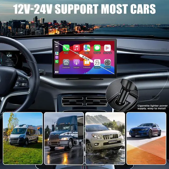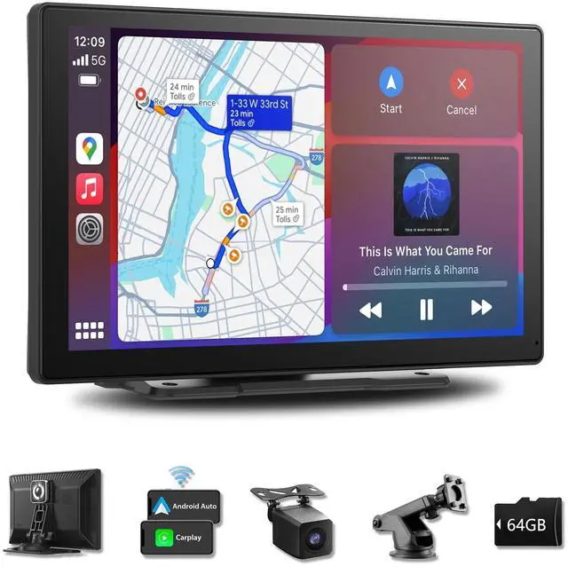 Simply interact with Siri or Google Assistant to make calls, listen to voicemails, send and receive texts, play music, and watch videosall without touching the screen, making hands-free operation seamless and safe. ^^ 9-Inch HD IPS TouchscreenFeaturing a 9-inch HD IPS touchscreen with a resolution of 1024x600, this car screen supports 1080P video playback for a crystal-clear, responsive viewing experience. With AirPlay and Android Cast support, you can effortlessly stream movies and videos from your smartphone to the car display. The real-time intelligent GPS navigation system offers precise turn-by-turn directions and live traffic updates, helping you navigate traffic.