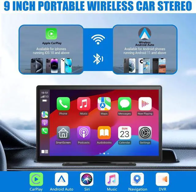 Wireless CarPlay & Android AutoThis portable wireless CarPlay display supports both wireless CarPlay and Android Auto. Easily connect your phone to your car without the need for a USB cable. With Bluetooth 5.0 and Wi-Fi, you can effortlessly access communication apps, maps, and emails on your cars radio. Enjoy a wider connection range, stronger signal, faster transmission speeds, and uninterrupted connectivity. ^^ Voice Control & Hands-Free OperationThe touchscreen carplay box is equipped with a clear microphone and speaker, allowing you to answer calls without holding your phone while driving.