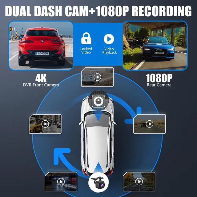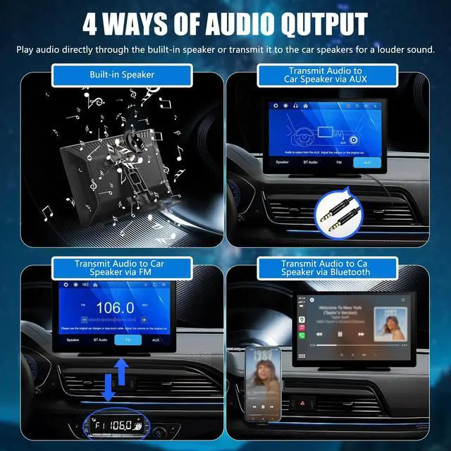 ^^ 4K Front + 1080P Rear Dash CamThis portable wireless CarPlay display includes a 4K front and 1080P rear camera, the dash cam can loop recording of driving activity. In the event of a collision or accident, you can instantly replay video footage to reveal the truth and avoid unnecessary trouble. The rearview camera automatically switches to the reversing view when shifting gears and comes with parking guidelines. With a built-in 64GB SD card, you can store a large number of videos and images. ^^ FM/AUX/Internal SpeakerYou can output audio through the built-in speaker or wirelessly transmit audio to your car speakers via Bluetooth or FM frequency when connected to CarPlay or Android Auto for louder, clearer sound.