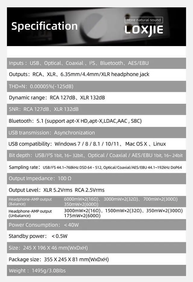 Fully balanced headphone amplifier design, high power output, with a 16 ohm output power of 6W and a 32 ohm output power of 3W. Three headphone output interfaces, namely 4-XLR, 4.4 mm, and 6.35 mm, to meet different purposes ^^ The all-new third-generation XMOS XU-316 supports PCM up to 32bit/768kHz and DSD up to DSD512; All other input ports support DSD transmission, coaxial, fiber optic, AES/EBU support DoP64 ^^ Equipped with DAC chip ES9039MSPRO and built-in MQA hard decoding; Support MQA decoding and MQA-CD ^^ The latest chip supports LDAC 24bit/96kHz, APTX/HDSBCAAC Equipped with full-featured remote control function ^^ The product you purchased will have a one-year warranty period.