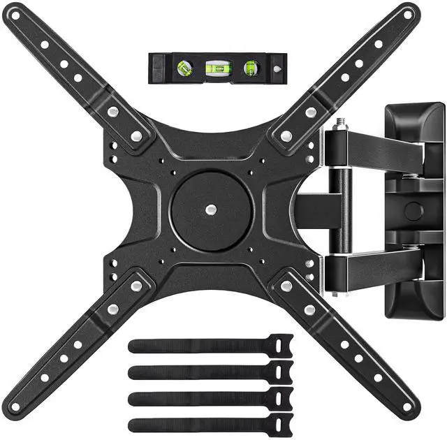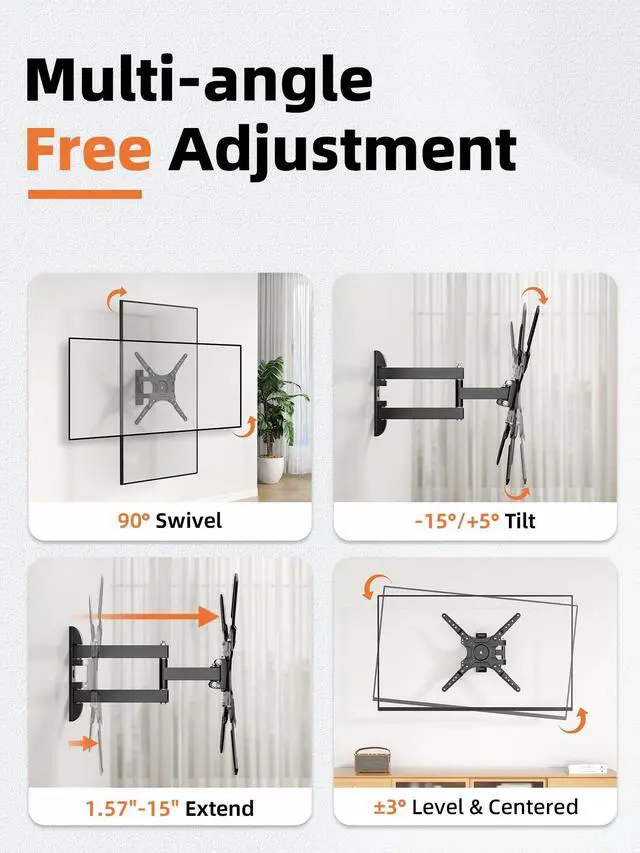 The double-arm design and rust-proof coating ensure reliable performance for daily use ^^ Extendable and rotatableThis full-motion TV wall mount extends up to 15 inches and retracts to just 1.57 inches. A swivel TV wall mount is a practical option for small spaces, corners, or apartments ^^ Multi-angle adjustmentThe TV stand adopts full-motion rotation and tilt design, which can effectively avoid glare from windows and lights. Adjust the screen +5/-15, swivel 90, and level 3 for your ideal anglesuitable for kitchens, gyms, or living rooms ^^ Easy installationThe universal TV wall mount comes with instructions, a level, and a full set of accessories for easy step-by-step installation.