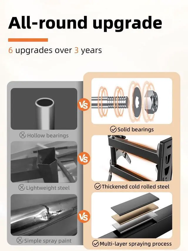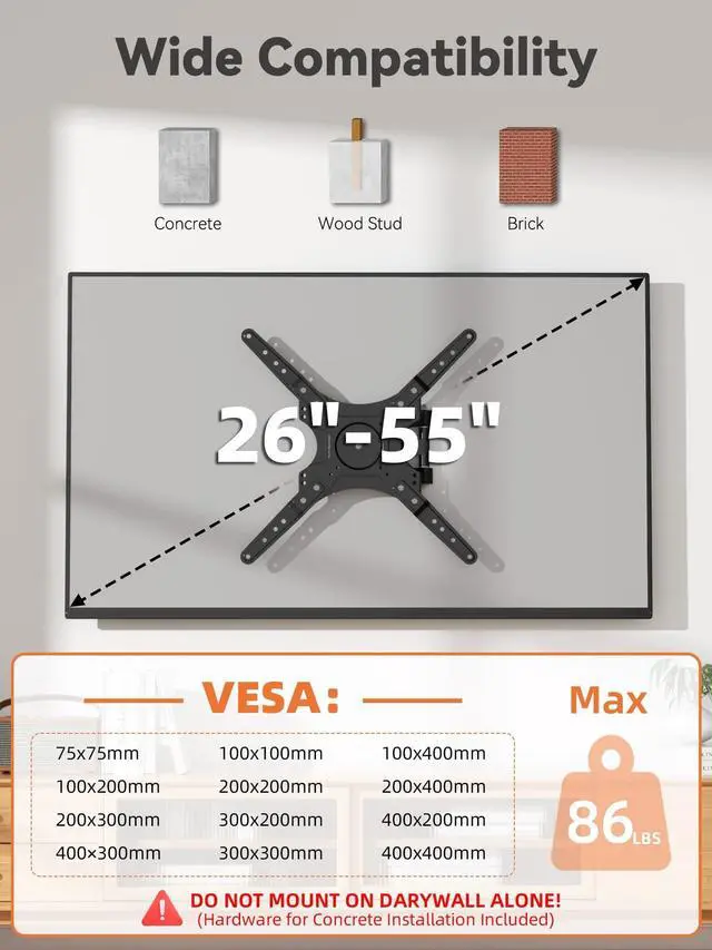 NOTICEPackaging upgrade and iteration in progress! Product supports up to 86 lbs (old box mislabeled 66 lbs, actual product supports 86 lbs) ^^ Compatible with most TVsThis articulating TV wall mount fits most 2655 inch TVs, including LED, LCD, OLED, and curved screens. Supports VESA interfaces from 75x75 mm to 400x400 mm, universal TV mount, compatible with Samsung, LG, Sony, TCL, Vizio, Hisense, and more ^^ Durable and reliableBuilt with reinforced cold-rolled steel, this full motion TV wall mount holds TVs up to 86 lbs.