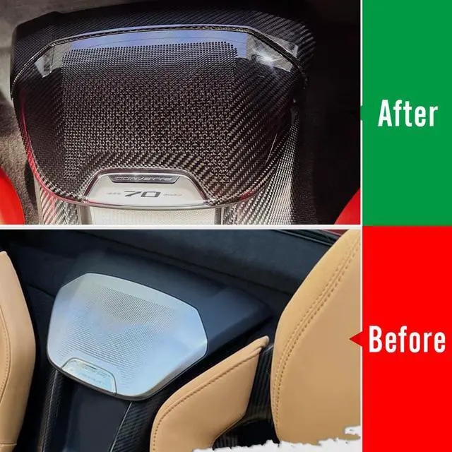 SuitableCompatible for C8 Corvette 2020 2021 2022 2023 2024 2025 2026 Stingray Convertible and Coupe ^^ DesignThis carbon fiber interior trim will go well with your original OEM one, upgrade your car trim level, add new-looking style ^^ FunctionOur upper sound speaker cover not only can decorate your car inner, but also can protect the plastic part against scratch, and tear ^^ InstallationAdd on style, tape at the back of product. Easy to install, no harm to your car ^^ HandicraftsOur carbon fiber products are using prepreg (dry) carbon fiber and the best CF production technologies available, with premium clear coat applied to protect and magnify the charm of carbon fiber woven patterns