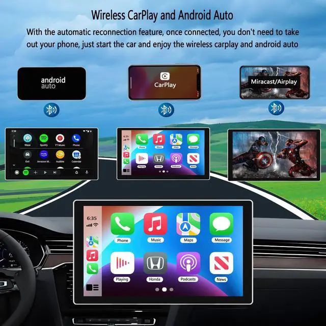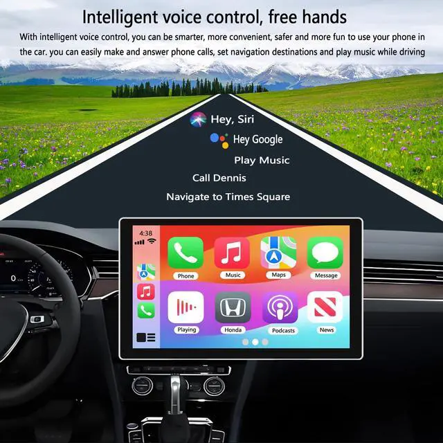 This is a brand new 7-inch high-definition portable carplay screen for car with silver-plated frame and 2.5D integrated full screen design, which is fashionableand beautiful. This carplay screen is compatible with wireless apple carplay and android auto, and supports intelligent voice control, making it easy for you to setnavigation destinations, make phone calls, play music, send and receive text messages while driving. This car play screen has a built-in 4K front dash camerawhich supports front and rear camera dual video recording, with the included 1080p rear camera to record every detail of your driving in real time.
