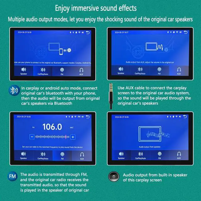 For you to experiencethe shocking sound effect, this portable car screen supports 3 sound output modes: Bluetooth, AUX and FM transmission, so that the sound can be easily outputfrom the original car's speaker. At the same time, This portable carplay screen for car is equipped with a adhesive rotatable dashboard bracket and a adhesive rotatablesuction cup bracket, which makes the installation easier and faster.