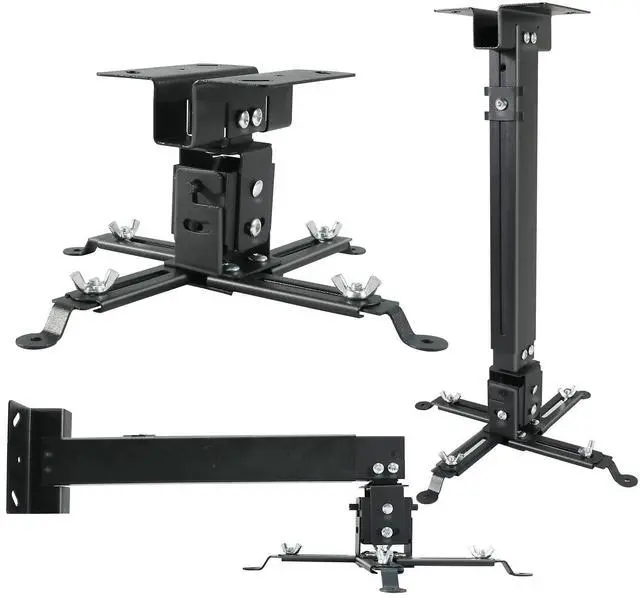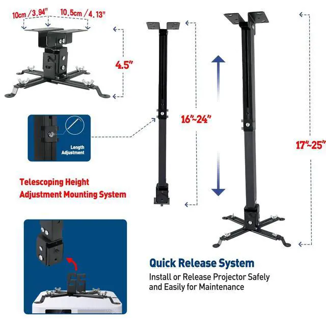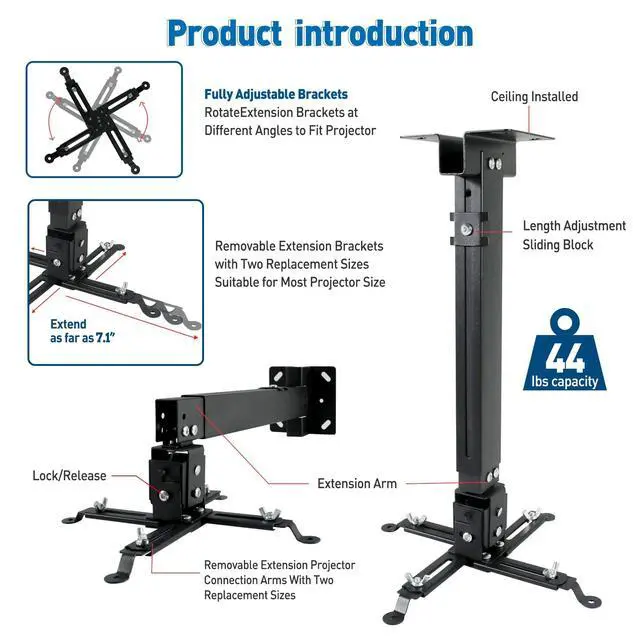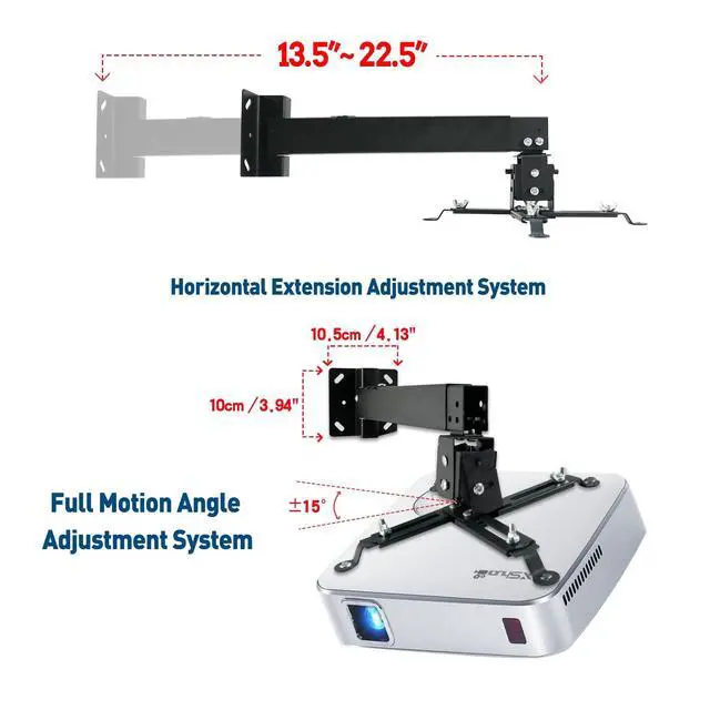 Wall-mounted installation(extension range: 16.9" - 25.6" ) ^^ Adjustable height, load capacity 44 lbsHeavy-duty commercial-grade steel construction and connect with a universal head, not a single hole, weight tested at 44 lbs to ensure projectors are in strong arms. Fully adjustable with 15-degree rotation horizontally (X-axis) to the left or right, 15-degree tilt vertically (Y-axis) up or down, highly maneuverable to help you get the most potential out of your projector. ^^ Quick release and no-slip The projector hanging mount is easy to install or disassemble with quick-release hooks which allow dismounting for servicing of filters and bulbs but notice still requires unscrewing 4 bolts to release the projector for security and stability. Exclusive "no-slip" adjustment system, lock in any position, easily release and lock. ^^ Universal mounting design Compatible with the projector models which have 3-4install holes and the mounting hole distance ranging up to 14.2 inches. This projector hanger is perfect for use in classrooms, boardrooms, hotels, home cinema, restaurants, or anywhere a projector needs to be mounted.