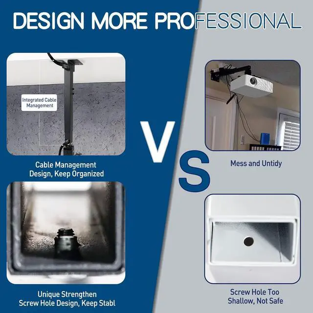 Upgraded cable management, safely contained The projector mounts adopt a large square tube design which helps keep HDMI, audio, and video cables concealed and organized, power cords and cables safely contained, keeps everything clean and organized, eliminate hazards due to tangled or stray electrical cables. ^^ Newly Designed 3-In-1 retractable 1.
