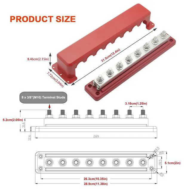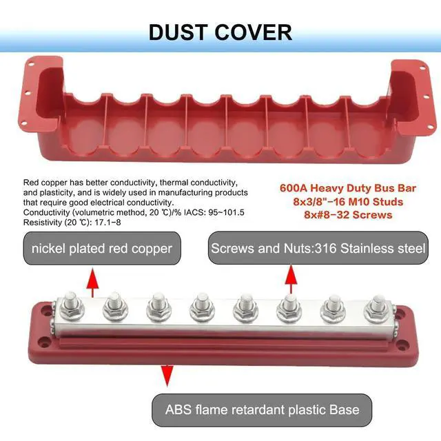 What You Get: 1x 600 Amp bus bar with 8x 3/8" studs terminal, 1x cover ( red) ^^ The Busbars are Climate Friendly. Safer Chemicals. contain Recycled Materials. Worker well-being. Economical Package