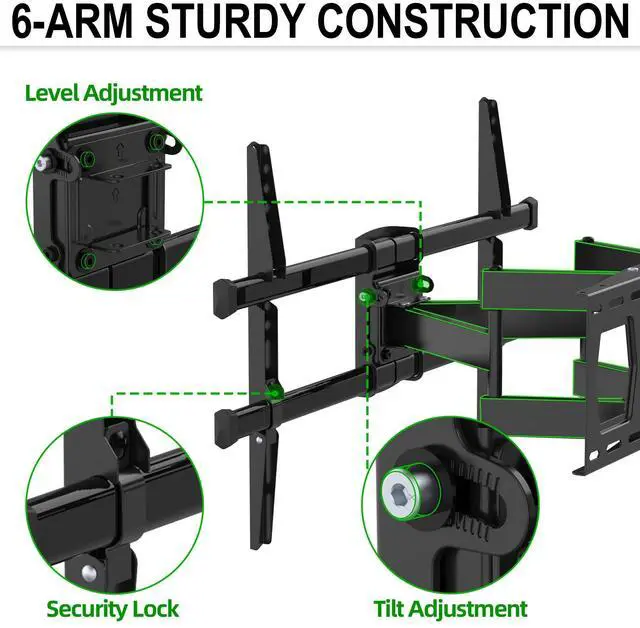 ^^ Space Saving: The dual-jointed arm design extends up to 16.73 and retracts to just 2.64 from the wall, optimizing your viewing experience while saving space and maintaining your room's aesthetics. The included 3 Velcro straps help organize TV cables, reducing potential safety hazards.