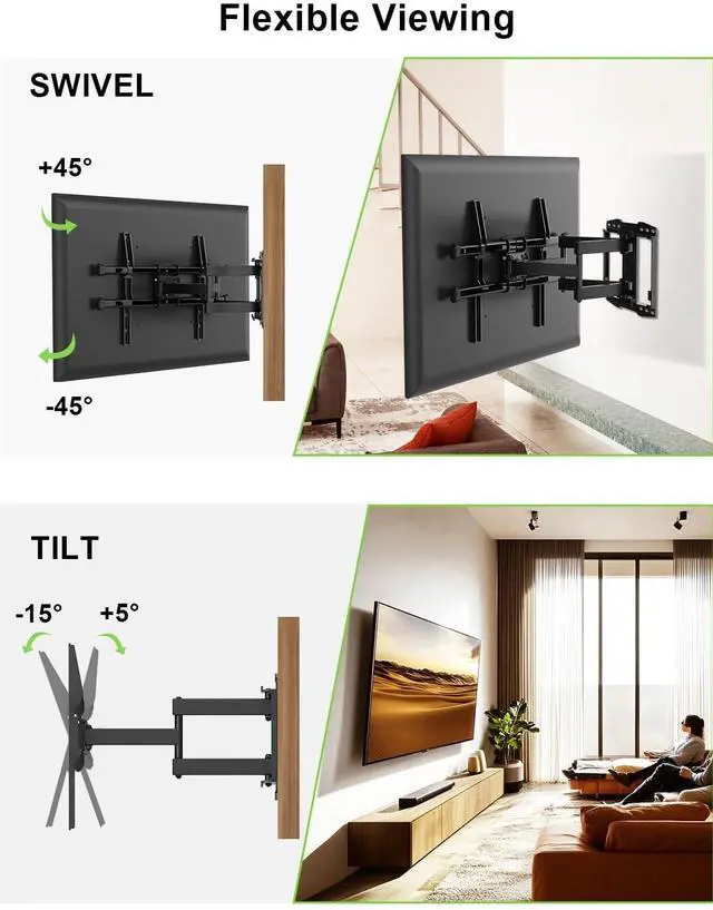 Flexible Adjustment & Comfortable Viewing: This TV wall mount supports 5/15 tilt adjustment combined with 45 swivel adjustment to reduce glare and help you find a comfortable, healthy viewing angle. The 4 horizontal adjustment ensures perfect TV alignment for an optimal viewing experience.