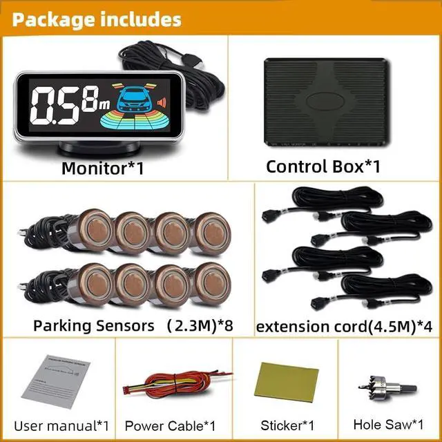 When the product is working, the sensor emits ultrasonic waves. When encountering an obstacle, the ultrasonic waves are reflected. The sensor receives the reflected signal and transmits it to the control box. Through calculation, the control box obtains the distance between the vehicle and the obstacle, and reminds the driver to pay attention through the display and sound, etc., to avoid danger. It is a good helper for us to drive the car! ^^ 1: When reversing, activate the rear 4 sensors and the front 2 sensors to detect and alarm. During normal driving, when braking, the 4 sensors in front of the car are activated to assist the driver to safely pass through narrow passages. When you release the brake, the parking sensor will work for about 15 seconds before stopping.