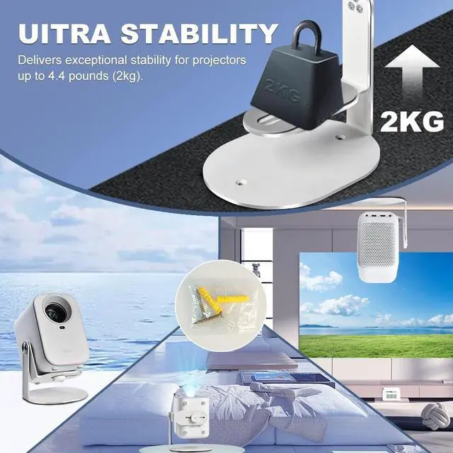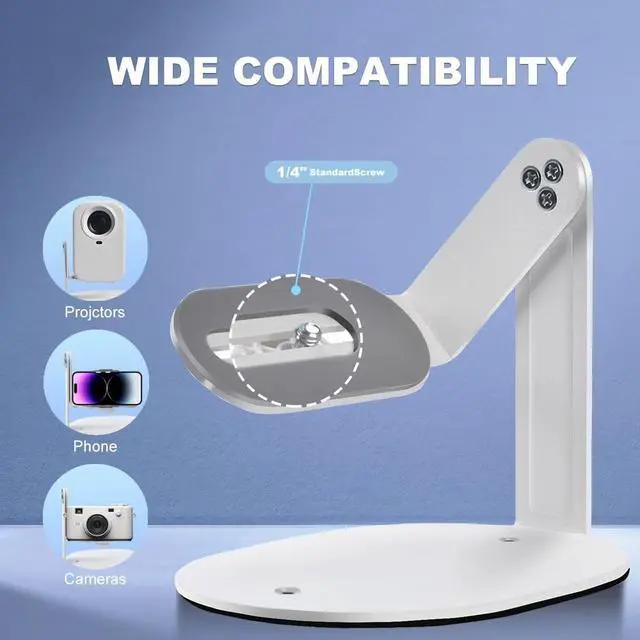 Universal 1/4" ( 6.35 mm) Mount - Fits most LCD/DLP projectors, compatible w Nebula, Xgi mi and more models from other brand. ^^ Ultra-compact and Rock-solid - This mini projector stand measures just 6.15. 5 inches and weighs only 1.4 pounds (650g), featuring premium construction that delivers exceptional stability for projectors up to 4.4 pounds (2kg). ^^ Multi-angle Rotation - This portable projector stand features a universal joint design with 360-degree swivel control for ceiling projection, allowing effortless adjustment to your perfect viewing angle, ideal for home, office, classroom and outdoor use.