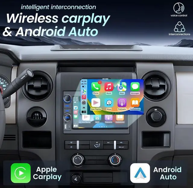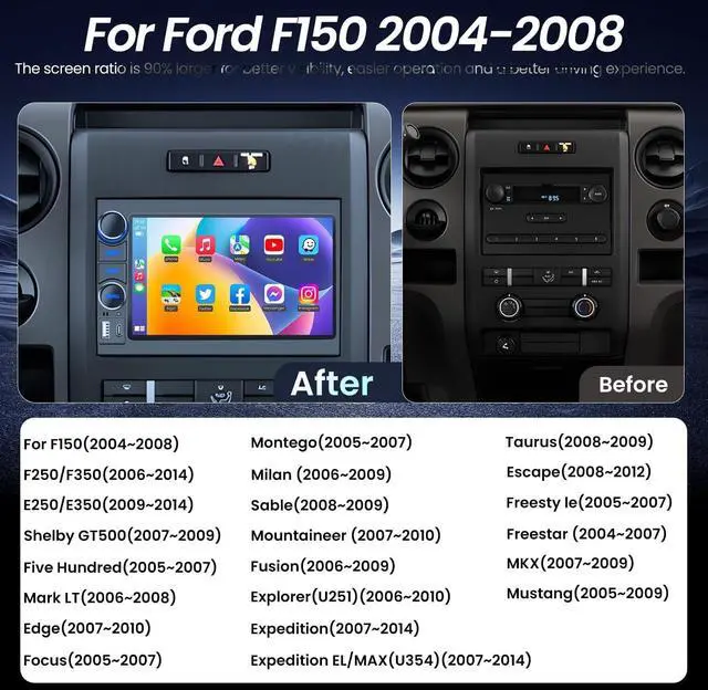 Vehicle CompatibilityFits Ford F150 (20042008), F250/F350 (20082016), E250/E350 (20092014), Edge (20072010), Taurus/Sable (20082009), Fusion/Milan (20062009), Focus/Montego/Freestyle (20052007), Explorer (20062010), Escape (20082012), Expedition (20072014). Also compatible with Lincoln MKX (20072009), Mark LT (20062008), Mustang (20052009). All cables included for quick, hassle-free installation. ^^ Carplay&Android AutoUpgrade your F150 (2004-2008) with this advanced Car Radio Replacement featuring Wireless Carplay & Android Auto. Enjoy seamless smartphone integration, allowing you to access apps, music, navigation, and more without the need for cables. With built-in GPS, Bluetooth, FM/RDS, and 5G WiFi, stay connected and entertained while driving.