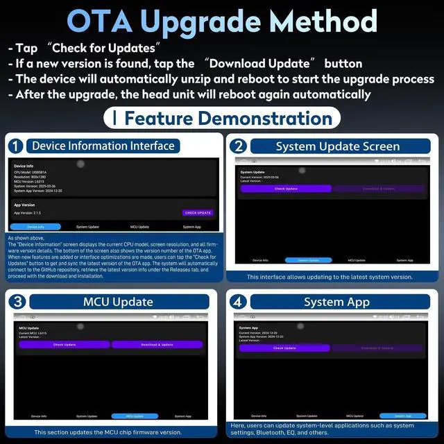 Stay connected on the go with 5G WiFi, offering lightning-fast internet speeds for streaming, browsing, and staying connected with friends or work while driving. Whether it's navigating new routes or enjoying seamless online entertainment, this system keeps you on track and connected wherever you go ^^ After tapping the Check for Updates button, the system compares the current firmware version with the version on the server. If the server version is the same or older than the current version, the system will notify that the device is already up to date and no upgrade is needed.