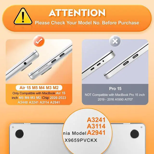 • Perfect Compatibility- Designed specifically for MacBook Air 15 inch 2026 2025 2024 2023 (models A3448 & A3241 & A3114 & A2941) with M5/M4/M3/M2 Chip. Please check the model number (Axxxx) on the bottom of your MacBook before purchasing to ensure a perfect fit.