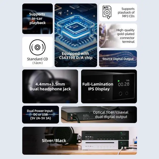 Extensive CD compatibility: The SMSL PL150 is easily compatible with standard CD/MQA-CD/HDCD, allowing you to enjoy your treasured CD collection on a single device. Experience smooth playback and expand your audio world.