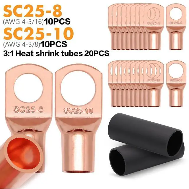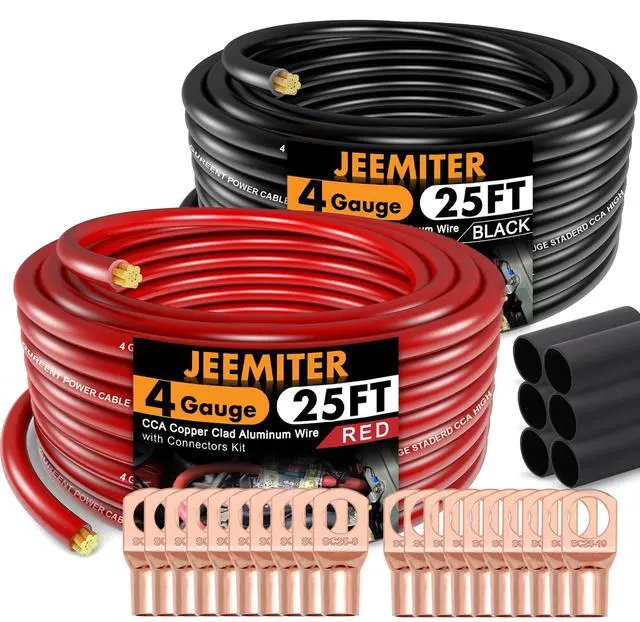 ^^ HIGH QUALITY MATERIALS - High quality stranded CCA wire offers strong power transfer performance, while remaining lightweight with maximum flexibility. Oxygen Free Coppe (OFC) wiring provides a superior electrical conductor to aluminum because it does not expand or contract with heat and can carry a higher current load. ^^ PACKAGE - 2 pcs 4 gauge black/red CCA power ground wire (25 feet of each color) 10pcs SC25-10" Battery Lugs10pcs SC25-8" Battery Lugs20pcs 3:1 Dual Wall Adhesive Heat Shrink Tubing. ^^ WIDE COMPATIBILITY - Our bundled power wire set is great for a car amplifier or subwoofer or to be used as a ground wire on your electric wire installs.