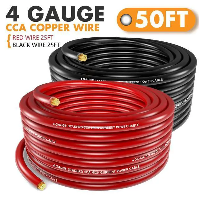 4 GAUGE 25-FEET( 7.62 m) OF EACH COLOR BLACK & RED CCA POWER GROUND WIRE - The lower the gauge number, the thicker the wire. Thicker wire presents less resistance to current flow. Copper coated aluminum gives you an economic power cable with excellent power transfer. ^^ RUGGED PVC JACKET - Low memory, flexible soft-touch jacket material is perfect for routing in hard to reach places, designed for the electrical and auto repair installer in mind. Strong, yet durable pvc jacket has has flexibility, elasticity, and impact resistance built in, is resistant to extreme temperatures, liquid, oil, gas, abrasions and high impact.