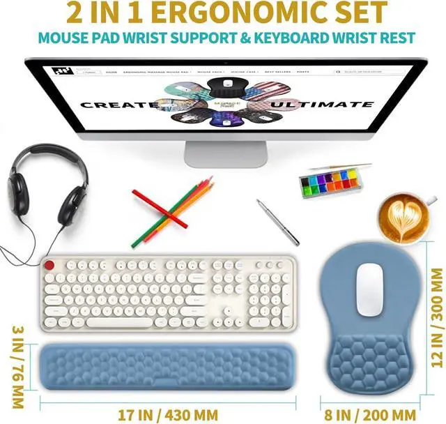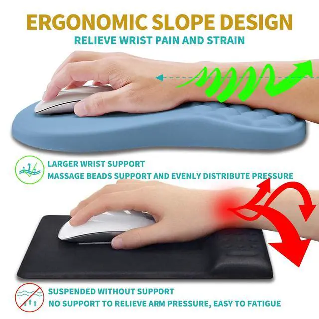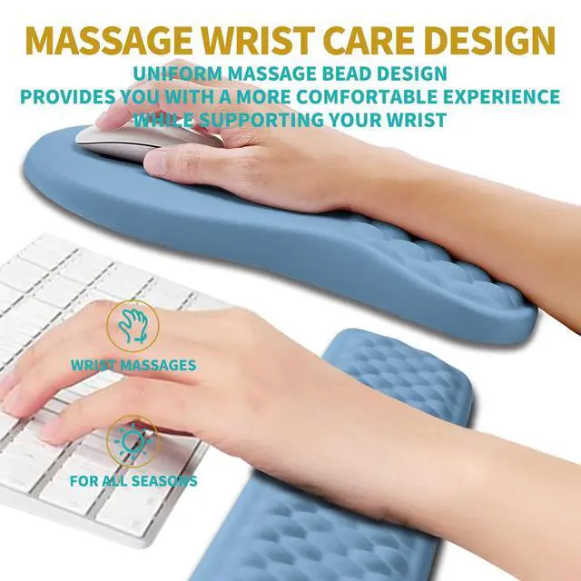 2 In 1 SetThe set includes an ergonomic mouse pad wrist support(12x8x 1.2 inch, 300x200x30mm) and a wrist rest for computer keyboard(17x 3.1 x 0.8 inch, 430x80x20mm). The massage bead design, filled with memory gel, can effectively improve carpal tunnel pain caused by long-term use of keyboard and mouse. ^^ Ergonomic Massage DesignThe innovative ergonomic slope and massage bump design perfectly support the wrist and palm. Massage bump design can effectively relieve wrist pain and fatigue, improve carpal tunnel syndrome (CTS), strengthen the air circulation between wrist and mouse pad, prevent sweating, and keep your wrist in the most comfortable state.