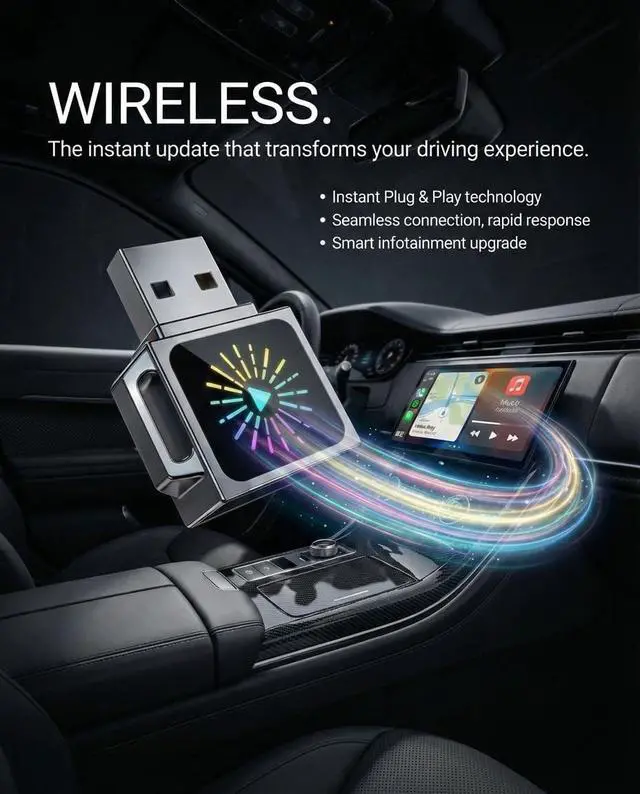 Wireless Instantly: Wireless CarPlay & Android Auto Adapter 2-in-1 Instantly converts factory wired Apple CarPlay or wired Android Auto to wireless. Your phone automatically reconnects every time you start the car, so you can enjoy navigation, music, calls, and messages without plugging in your phone. ^^