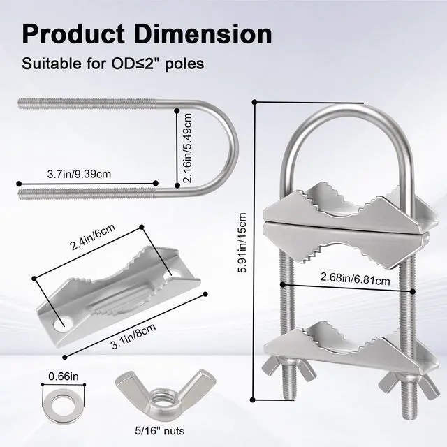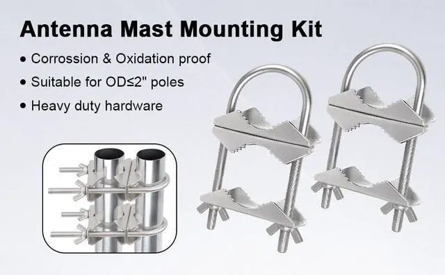 ^^ WIDE COMPATIBILITY - This Mast to Mast Clamp is designed to accommodate poles with diameters ranging from 1 to 2.1 inches (25-54mm). It is compatible with a wide range of applications, including WiFi, PCS, Cellular, and TV antennas, as well as flagpoles, umbrellas, fishing rods, and various outdoor decorations. ^^ EASY INSTALLATION - The mast mounting clamp features a user-friendly design that allows for quick and effortless installation. With its hand-tightened Wing Nuts, you can securely mount your antenna effortlesslyno tools required. ^^ PACKAGE LIST - Each package includes 6 sets antenna mast clamps (18 jaw brackets, 6 U-bolts, 12 nuts, and 24 washers)