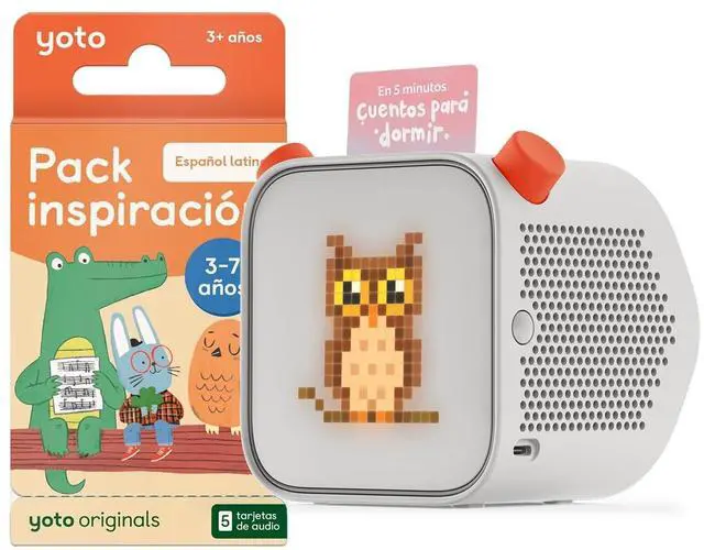 5 minutos: Cuentos para dormir, 12 canciones para bailar y jugar, Mis primeras 100 palabras en ingles, Juegos y retos antiaburrimiento, Tarjeta creativa. ^^ EASY TO SET UP & USE: Simply pop an audio card into the Player to play & remove to stop. Use the large dials to adjust the volume & tracks or control the device via the free App! ^^