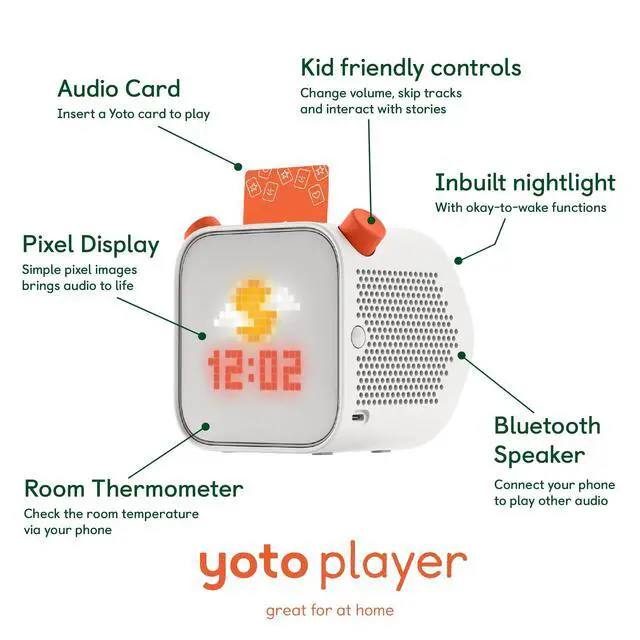 ^^ MULTI-PURPOSE: Features a vivid pixel display to bring the audio to life, play sleep sounds, use as a bedtime storyteller with nightlight, an alarm clock with time-to-rise function, a room thermometer, a portable Bluetooth speaker or use with headphones! ^^ CONTENT THAT GROWS WITH KIDS' MINDS: Explore 1000+ cards of bestselling novels, music, activities, free podcasts, radio, soundscapes, timers or even create content with a Make Your Own card!