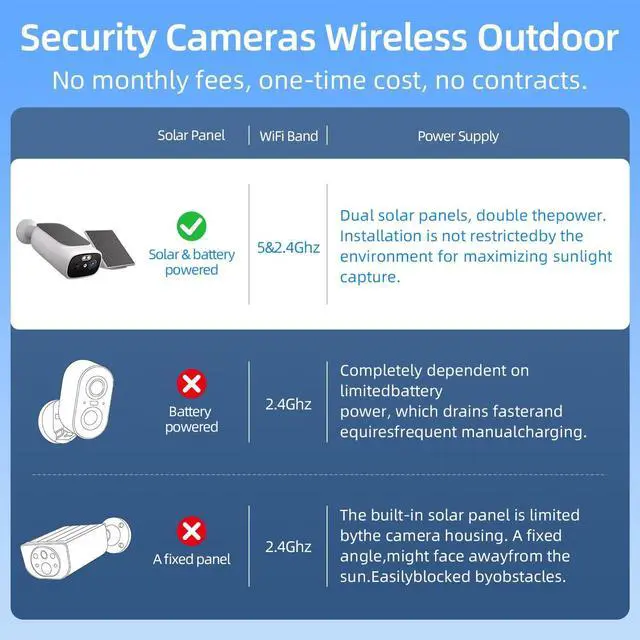 Uninterrupted Power for Peace of Mind- Solar-Powered & 9600mAh High-Capacity Battery Addressing the pain of frequent battery replacements, CAMOON's wireless outdoor security camera combines an embedded solar panel and a robust 9600mAh battery to ensure 365 days of uninterrupted power, giving you peace of mind without the worry of dead batteries. ^^ Stable WiFi Connection for Seamless Monitoring- 5/ 2.4GH z Dual-Band Networks Eliminating the frustration of unstable WiFi connections, our camera supports both 5GHz and 2.4GH z dual-band networks, providing a reliable and stable connection that's easy to set up in just 2 minutes, ensuring seamless monitoring wherever you are.