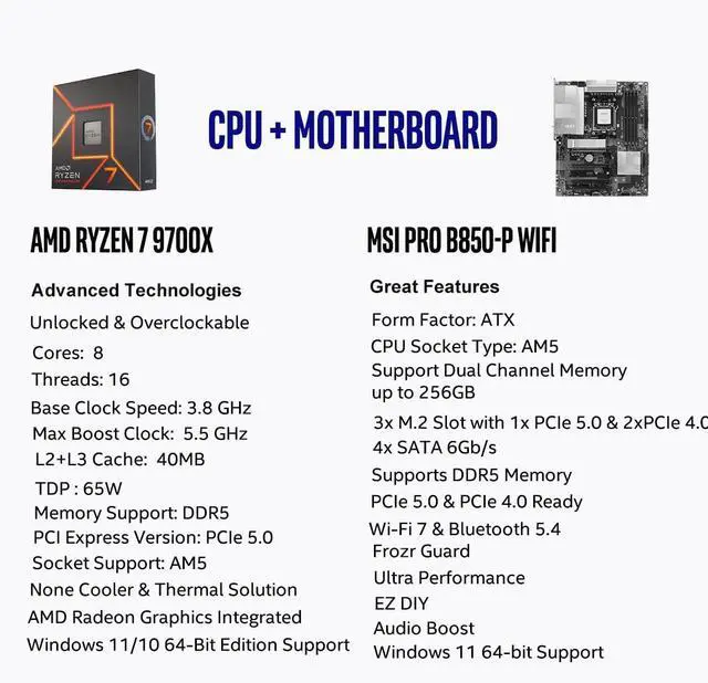 OS Support: Windows 11/ 10-64-Bit Edition. Thermal Solution (PIB) Not Included. AMD Radeon Graphics Integrated ^^ MSI PRO B850-P WiFi Motherboard, ATX Form Factor, Socket AM5, Support Dual Channel DDR5 up to 256GB, Supports PCIe 5.0 x16, 3x M. 2 NVMe Slot with 1x PCIe 5.0 x4 & 2x PCIe 4.0 x4, 4x SATA 6GB/s, 2x USB 10Gbps Type, Wi-Fi 7, Bluetooth 5.4, Support for Windows 11 64-bit, Supports AMD Ryzen 9000/ 8000/ 7000 Series Desktop Processors ^^ Supports DDR5 Memory, Dual Channel DDR5 8200+ MT/s (OC); /
