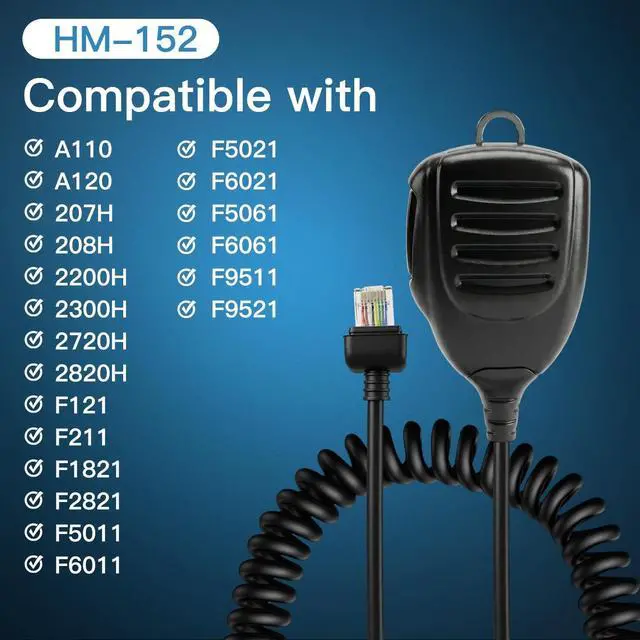 Compatible Information: HM-152 HM152 speaker microphone is compatible with a wide range of mobile radios, including A110 A120 207H 208H 2200H 2300H 2720H 2820H F121 F211 F1821 F2821 F5011 F6011 F5021 F6021 F5061 F6061 F9511 F9521 ^^