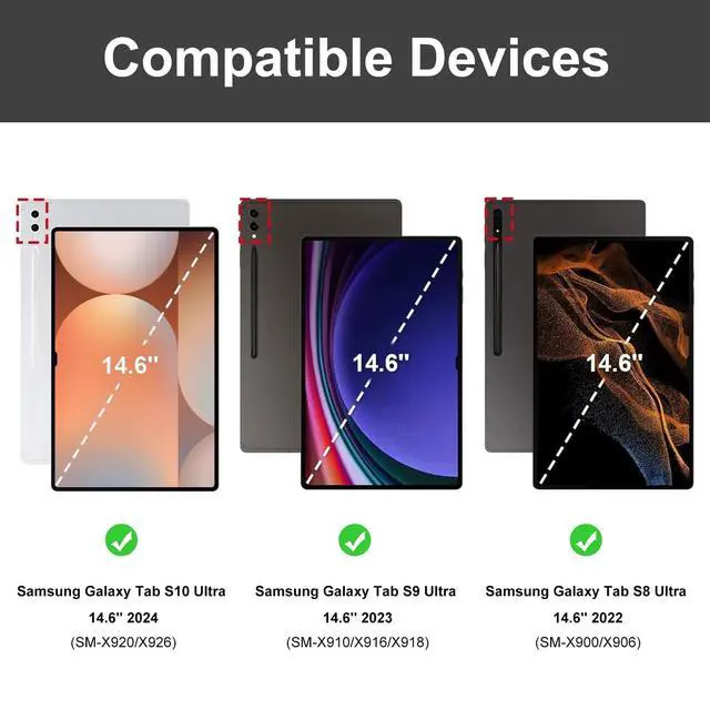 Compatible Devices: The Samsung Galaxy tab 14.6 inch keyboard case is only compatible with Samsung Galaxy Tab S10 Ultra 14.6 inch Model SM-X920/X926B/X926N/X920N 2024 Release, Samsung Galaxy Tab S9 Ultra 14.6 inch Model SM-X910/X916/X918 2023 Release, Samsung Galaxy Tab S8 Ultra 14.6 inch Model SM-X900/X906 2022 Release ONLY. Please check your model carefully, avoid buying by mistake