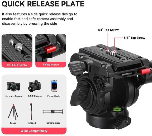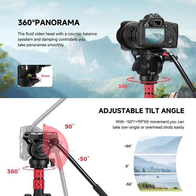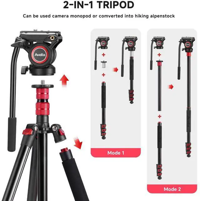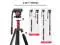Professional Fluid HeadSupport 360panorama and +90/ -50 tilted. 4.18 lbs lightweight with max. load 13.2 lbs. Extends from 22.8" - 78.3". Standard 1/4" compatible for most dslr cameras and camcorders. Extended 1/4 interface can be connected with camera accessories such as led light, microphone, etc. ^^ 2-IN-1 Tripod designThe monopod can be detached from the tripod, and the Monopod can be adapted to the photographers needs for different shooting. ^^ Easy Set Up the 4-section aluminum tripod leg extends to a maximum height of 78.3", equipped with ergonomic flip locs which snap open and closed to ensure fast operation.
