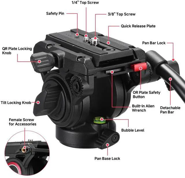 : 13.2 lb Loading Capacity ^^ 22.8" to 78.3" Height Range ^^ Tilt Angle +90 / -50 ^^ 360 Panning ^^ 60mm Ball Diameter ^^ Fluid Head ^^ Video Tripod Leg ^^ Carrying Bag.