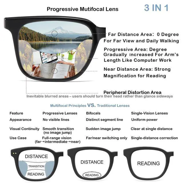 • Progressive Lenses for Versatile Use Progressive Lenses for Versatile Use These rogressive Multifocus Reading Glasses provide a seamless transition between different viewing distances, making them perfect for reading, working on a computer, or everyday tasks. Enjoy clear vision at any range without the need for multiple pairs of glasses.